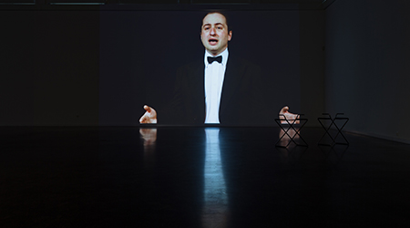 Immaterielle Produktion The video Immaterielle Produktion shows an actor who recites a text by Karl Marx about the role of the artist in capitalist production while he is in a headstand. After the recording, the video was turned around, so the actor seems to be standing normally. Nevertheless, his facial expressions show the effort and concentration that points to the productive work that is cited in the text. |