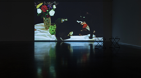 Bankett Bankett shows a table arranged with food, wine and flowers. The mise-en-scéne of the food and the tablecloth is strongly reminiscent of dutch banquet still-lifes of the 17th century. The static arrangement is suddenly interrupted by two cats jumping on the table and starting to eat the food. Through their interaction, the cats create two still-lifes: the arranged one before their appearance and the new, altered one. |