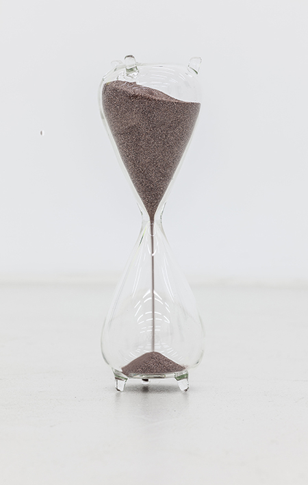 Die Gegenwart der Zeit 2021, Sanduhr aus Laborglas, Sand aus gemahlenen fossilen Dinosaurierknochen Eine Sanduhr wurde mit Sand befüllt, der aus gemahlenen, fossilen Dinosaurierknochen gewonnen wurde. Der Ursprung des Sandes verweist auf die uns beinahe unendlich erscheinende Zeitspanne, die seit dem Aussterben der Dinosaurier verstrichen ist. Gleichzeitig wird so das Verstreichen der Zeit ins Bewusstsein gerückt, während der Sand durch die Uhr rinnt. Beide Zeitebenen werden ineinander verschränkt und so erfahrbar. |