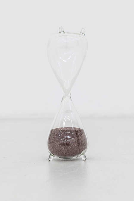 The presence of time 2021, laboratory glass hourglass, sand from ground fossil dinosaur bones An hourglass was filled with sand obtained from ground fossil dinosaur bones. The origin of the sand refers to the seemingly almost infinite amount of time that has passed since the extinction of the dinosaurs. At the same time, the passing of time is thus brought to mind as the sand slips through the clock. Both levels of time are intertwined and can thus be experienced. |