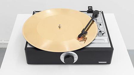 Nationahymnen For the work Nationalhymnen, all national anthems of the nearly two hundred Nations recognized by the United Nations, were superimposed on a single sound track in such a way, that all hymns end simultaneously The sound file formed from many individual pieces of music is recorded on a vinyl record. This record is then plated with gold, which refers to the Voyager missions of NASA. |