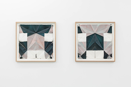 Origami (B-2 Stealth Bomber) Die Faltungen Origami (B-2 Stealth Bomber) entstanden, nachdem ich jeweils ein Origami eines Flugzeugs faltete und anschließend wieder entfaltete. Die Form des Flugzeugs entstand als Nachbildung des Tarnkappenbombers B-2 Spirit. Diese habe ich dann von oben und unten mit jeweils unterschiedlich farbigen Lacken besprüht. Daher stammen die Muster und Farben des entfalteten Papiers, dass sich so in eine abstrakte künstlerische Arbeit verwandelte. Ich verwendete sogenannten Chamäleonlack, der die Farbe je nach Lichteinfall ändert. Damit nehme ich Bezug auf die Tarntechnologie des B-2 Bombers. |
