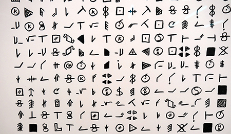 OK Das Wort "OK" gilt als das meistgesprochenste Wort der Welt. Seine Herkunft ist nicht vollständig geklärt und stammt vermutlich von einer fehlerhaften Schreibweise der Worte "oll korrect" (all correct). Verwendet wird es üblicherweise im Sinne von "Alles in Ordnung". Für die Arbeit OK wurde die Zeichen des Wortes aus jedem auf der Welt verwendeteten Alphabetsysteme übereinandergelegt. Daraus ergibt sich eine neue Glyphe, in der schattenhaft Teile der verwendeten Symbole zu sehen sind, die zusammen ein neues Zeichen ergeben. |
