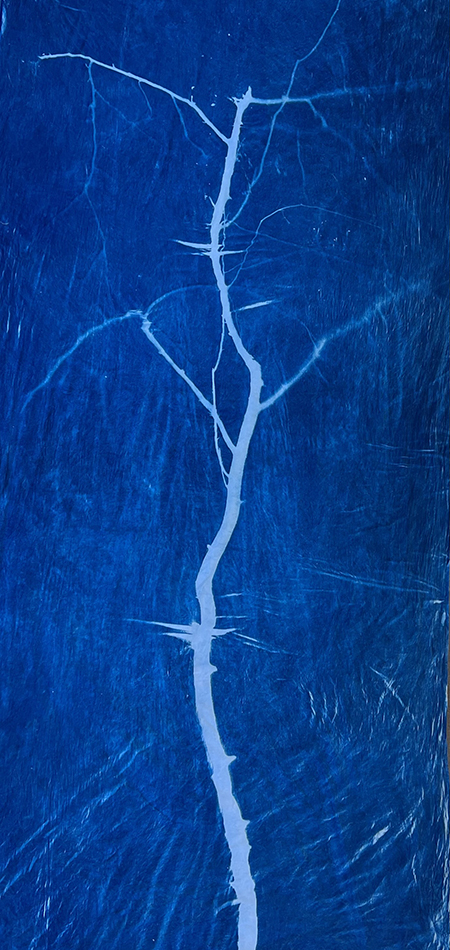 Past and Future Forest Since 2022, Large scale cyanotypes of dead trees, 2.4 x 6 meters. Well over half of europe's forests are threatened by windthrow, forest fires, insect infestations, or a combination of several of these factors - the cause is climate change. These facts are difficult to grasp, the dimension unimaginable. i therefore want to capture them in an artistic way, to make large-format cyanotypes of dead trees in order to preserve their image. |
